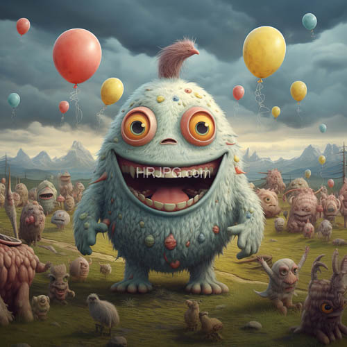 Whimsical fluffy blue monster with large yellow eyes a wide toothy grin and a small pink tuft of hair stands in a grassy field