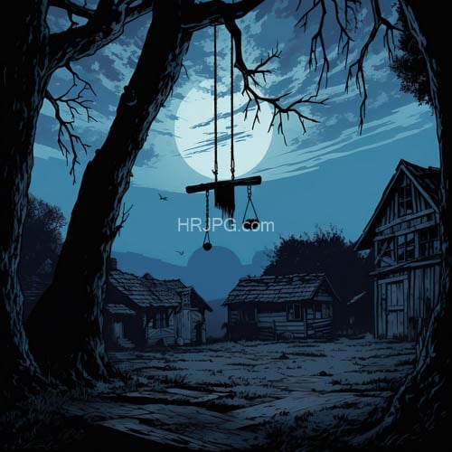 Dark moody blue palette with a full moon illuminates a rural village scene framed by a gnarled tree with a wooden hanging scale