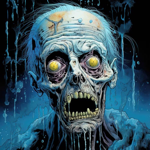 Grotesque decaying zombie with a pale blue-tinged skull yellow glowing eyes and a gaping mouth is visible with cracked textured skin and yellowed teeth