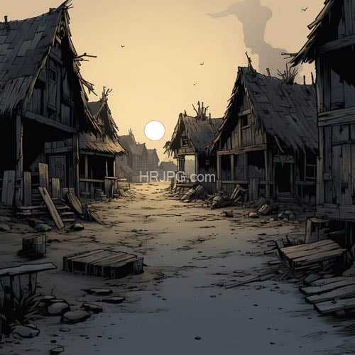 Dark moody scene depicts a deserted ruined village at sunset with weathered thatched-roof wooden huts broken windows and debris-filled ground
