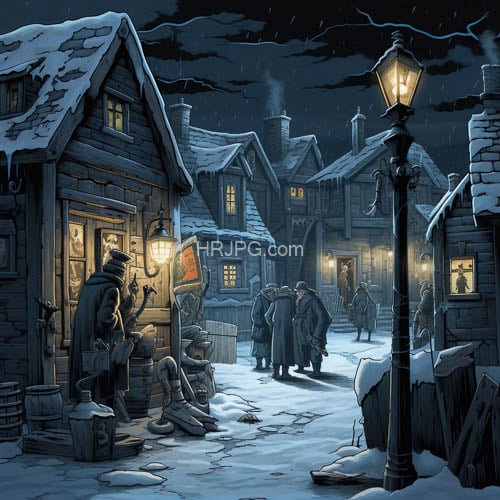 Snowy nighttime village features wooden cottages with glowing windows and snow-covered roofs line the street with a cloaked figure reading a letter by a door