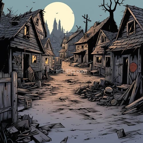 Dark comic scene depicts a deserted ruined village at night showing dilapidated wooden houses with broken roofs and windows scattered debris on a muddy path