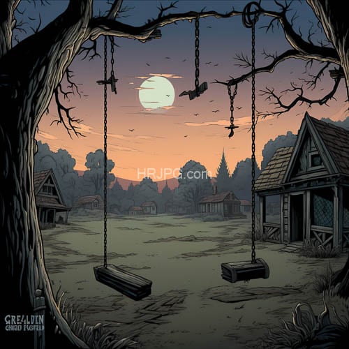 Spooky twilight village scene features two empty wooden swings hanging from a gnarled leafless tree with dilapidated wooden houses in the background