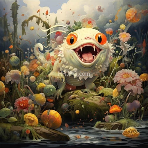 Cute white fluffy orange-eyed creature with a wide-open mouth stands surrounded by vibrant oversized flowers and colorful mushrooms in a lush whimsical garden