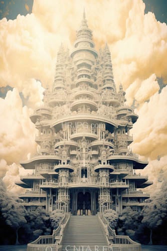 Massive intricately detailed multi-tiered temple with numerous spires is set against a sky filled with fluffy golden clouds featuring ornate carvings and balconies