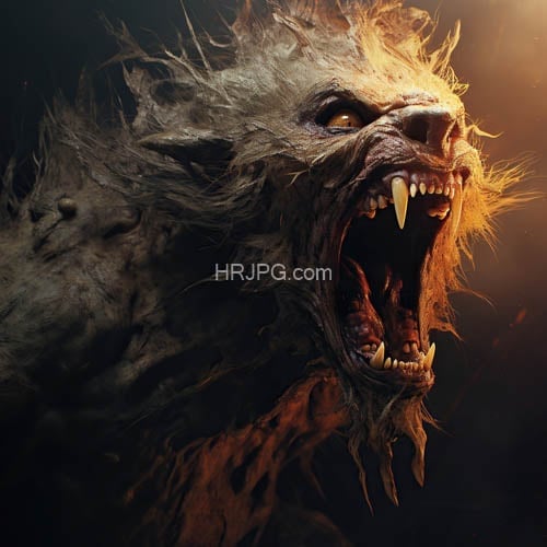 Close-up of a snarling werewolf with wild disheveled gray fur sharp yellow fangs and glowing yellow eyes showing its mouth wide open