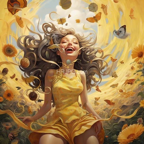 Joyful young woman with flowing gray hair wearing a yellow dress lies in a sunflower field surrounded by floating sunflowers leaves and butterflies