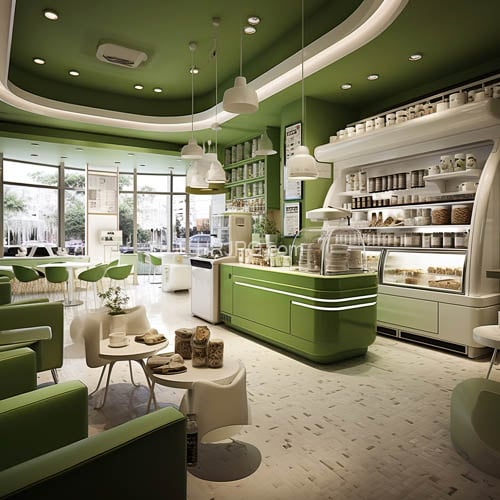 Modern green-themed cafe features a curved ceiling green and white furniture a glass display case of pastries and a white tile floor