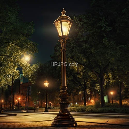 Nighttime urban park scene features a tall ornate black metal street lamp glowing warmly in the center surrounded by lush dark green trees
