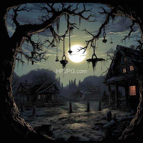Spooky moonlit graveyard at night is framed by a gnarled leafless tree with hanging lanterns and two dilapidated wooden houses with lit windows