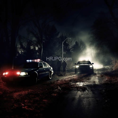 Dark foggy night scene features two police cars with flashing red and blue lights on a wet reflective road with three silhouetted officers standing nearby