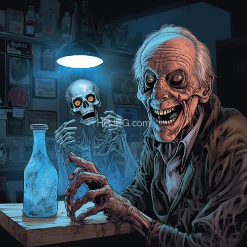 Grotesque elderly man with wrinkled skin white hair and a wide menacing grin sits at a wooden table holding a blue cracked glass bottle