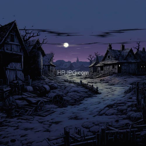 Deserted moonlit village at night shows a purple sky with a full moon casting dim light on dilapidated wooden houses leafless trees and scattered barrels