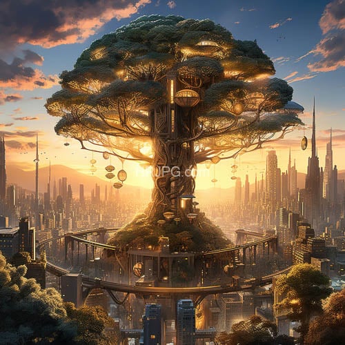 Massive futuristic tree with intricate glowing orbs and structures integrated into its trunk stands in a sprawling high-tech cityscape at sunset