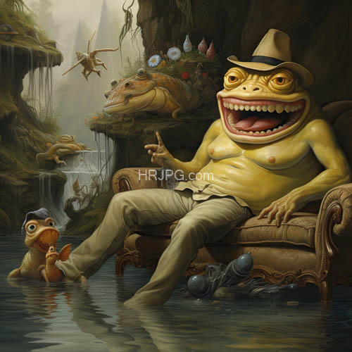 Large yellow anthropomorphic frog with three eyes wearing a beige hat and pants lounges on a vintage armchair in a surreal swampy landscape