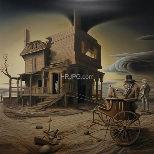Desolate abandoned wooden house with a broken chimney stands surrounded by a barren landscape with a lone figure in white on the porch steps