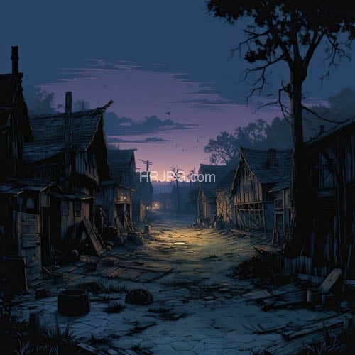 Dark abandoned village at twilight features dilapidated wooden houses with broken roofs and scattered debris on a cracked dirt path illuminated by dim yellow light