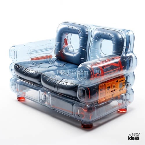 Futuristic transparent plastic couch with black inflatable cushion seats