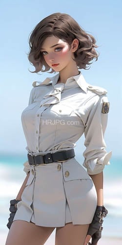 Young attractive woman with brown hair and blue eyes wears a white military shirt high-waisted skirt and black gloves showing a confident expression