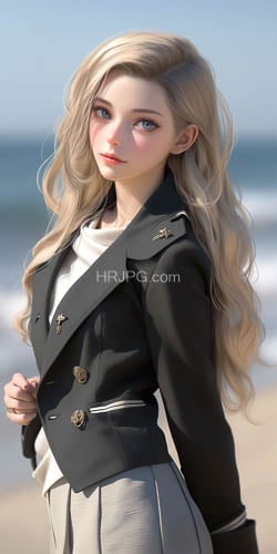 Young fair-skinned woman with long blonde hair and blue eyes wears a black military jacket and grey pleated skirt standing on a beach