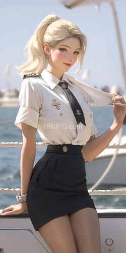 Blonde woman with fair skin wearing a white naval shirt black tie and black skirt is standing on a boat holding her tie