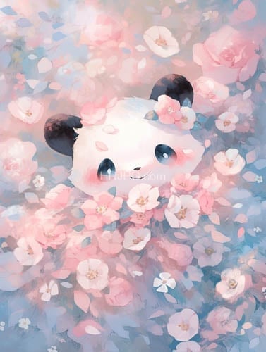 Cute chubby panda with large expressive blue eyes is partially obscured by a dense pastel-colored field of pink and white cherry blossoms