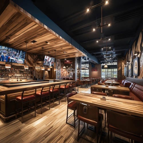 Modern rustic-style bar and restaurant features wooden ceiling panels dark blue walls wooden floors red cushioned barstools and wooden tables with matching benches