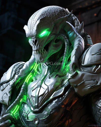 Menacing humanoid alien with a skeletal scaly head and glowing green eyes wears intricately detailed metallic armor with green glowing accents