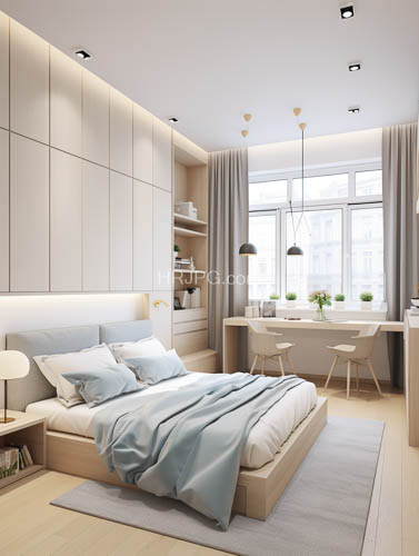 Modern minimalist bedroom features light wooden furniture a bed with blue and white pillows and a duvet centered on a light gray rug