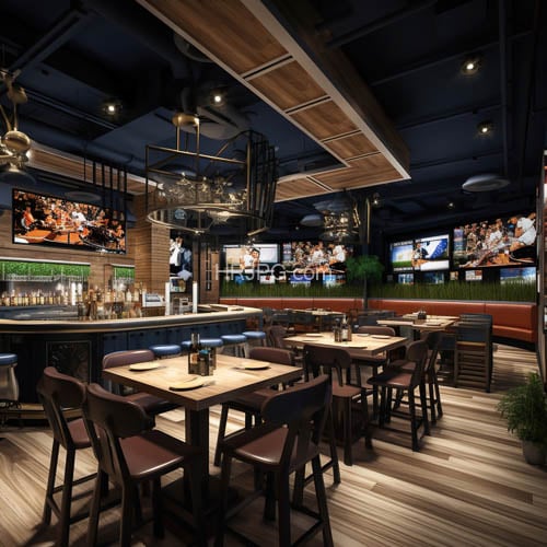 Modern sports bar features dark blue walls wooden ceiling panels striped wooden floors a glass-top counter with a mirror and multiple flat-screen TVs displaying sports