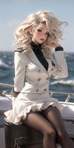 Beautiful blonde-haired woman in an anime style wears a white naval officer's uniform black lace top and stockings sitting on a boat's deck