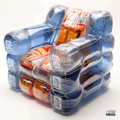 Unique inflatable armchair made from blue and orange plastic packaging materials has a shiny reflective surface with visible seams and a quilted pattern