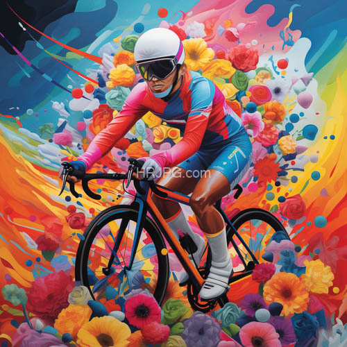 Black cyclist in a vibrant colorful scene wears a white helmet and cycling suit riding an orange road bike amidst a dynamic explosion of multicolored shapes