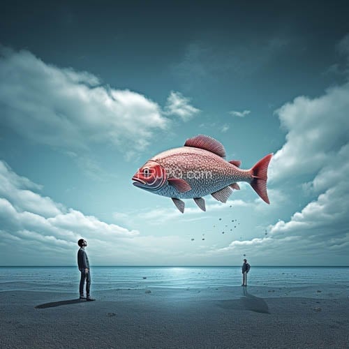 Surreal beach scene depicts two people standing on wet sand gazing at a massive vividly colored red and white fish floating in the sky