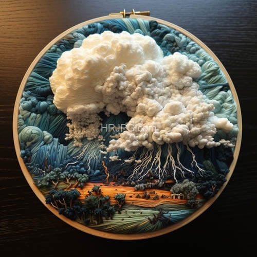 Detailed three-dimensional embroidery piece depicts a dramatic storm scene with large textured white clouds over a dark blue mountainous landscape