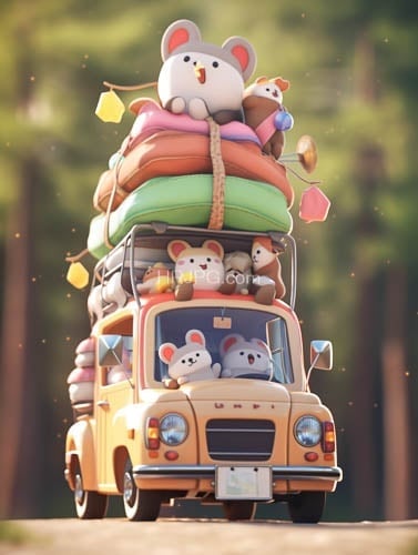 Yellow vintage SUV packed with adorable cartoon-style stuffed animals including white mice and colorful plush toys drives on a forest road