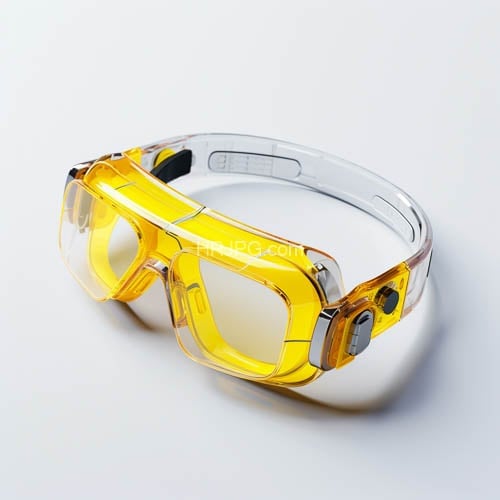 Transparent yellow safety goggles with a glossy finish feature clear plastic frames and yellow-tinted lenses in a sleek futuristic design with silver accents