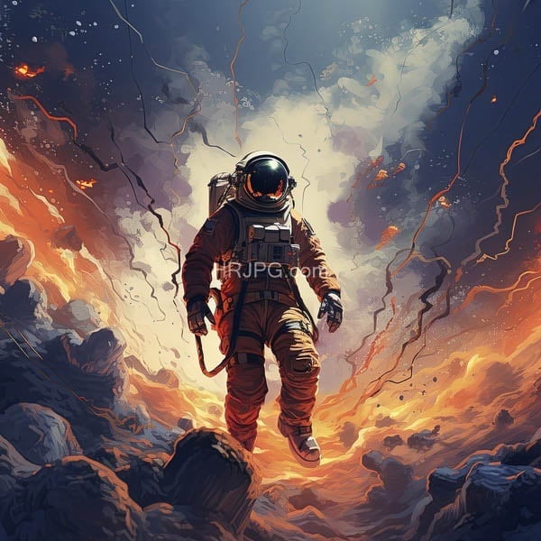 Celestial traveler wading through a tide of burning orange clouds