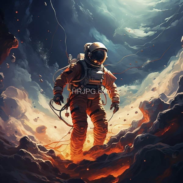 Stardust explorer walking across a jagged crust of cooling magma