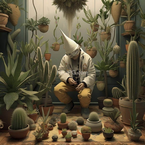 Crimson robed figure dwelling within a silent hall of cacti