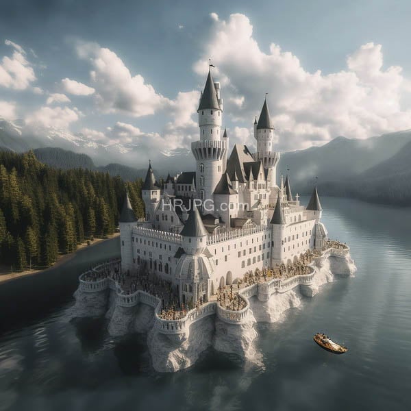 Ethereal kingdom hovering between snowy peaks and a sapphire lake
