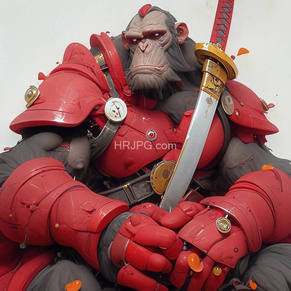 Crimson armored primate wielding a cold steel blade of honor