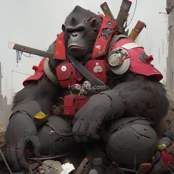Simian warlord clad in blood red plate ready for battle